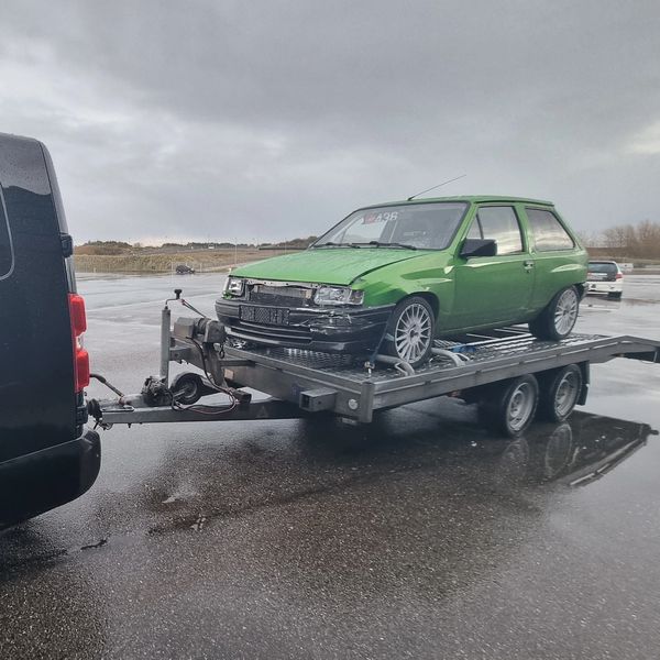 dunne plaatwerk was het front linksvoor flink beschadigd, de bumper kapot en de radiator aan deonderkant bij een bevestigingspunt open gescheurd. De Corsa werd de baan afgesleept en hij moest op de trailer terug naar huis.