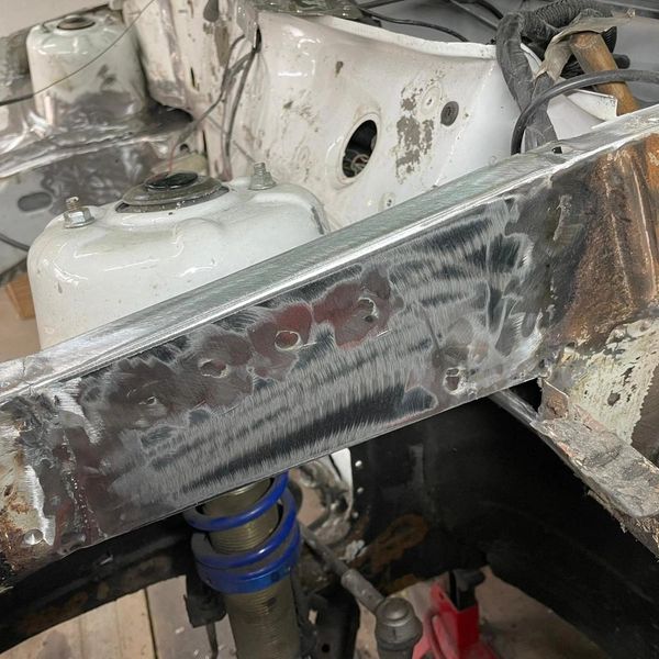 gemaakt en er ingelast. Omdat de balken toch al open geslapen waren om het roest te verwijderen en van binnen te behandelen, heb ik de balken ook van binnenuit volledig door gelast vooreen extra stevige verbinding. Daarna is het Competition versteviging set er ook ingelast en is de motorruimte verder ook vakkundig door gelast en in de grondlaag of zwarte tectyl gezet.