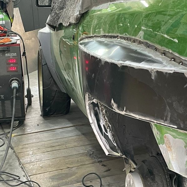Het nieuwe achter zijscherm zette ik eerst over het bestaande zijscherm heen om zo de lijnen en passing te controleren en aan te passen. Vervolgens de slijptol in het oude scherm eruit en lastte ik het nieuwe verbrede scherm erin. Vervolgens hebben we toch de achterbumper nog weer verbreed en aangepast aan de lijnen van de auto.
